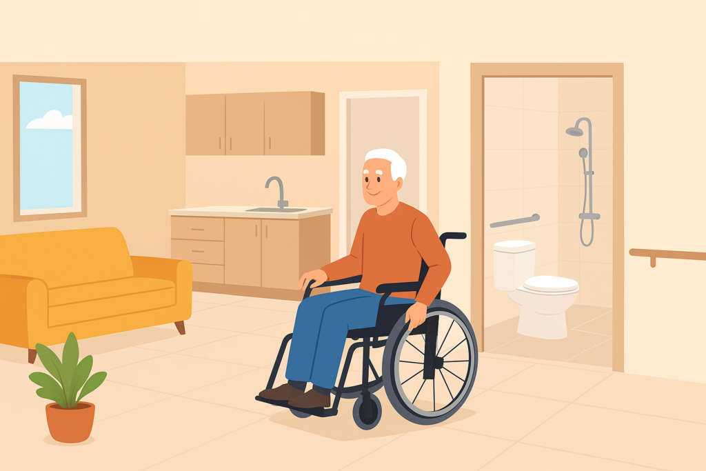 - Cửa chính và cửa phòng nên có chiều rộng tối thiểu 80–90cm, đảm bảo xe lăn đi qua dễ dàng.